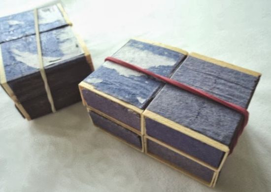 Comece colando as caixas de fósforo com o auxílio da cola branca comum. E para fixar melhor, posicione os elásticos para dinheiro. E cole a metade das caixas de fósforo de cada vez. Deixe secar muito bem antes de manusear a sua peça.