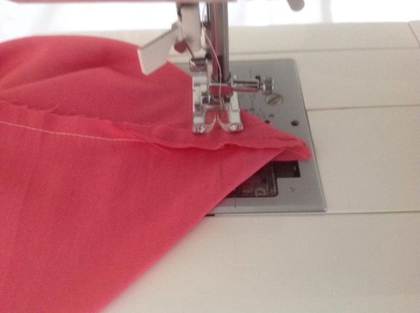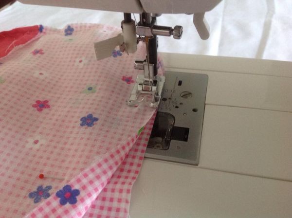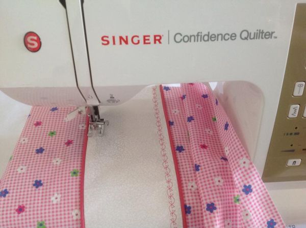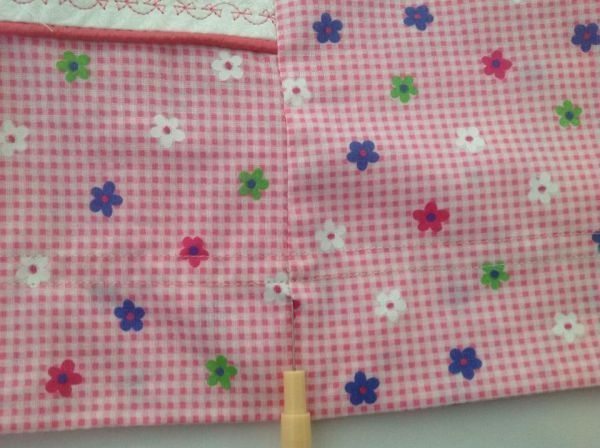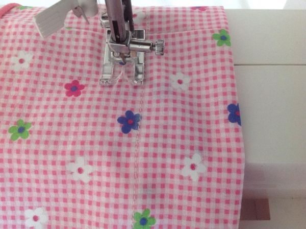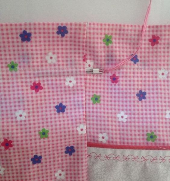 Em seguida, no tecido rosa, costure a faixa floral em uma das extremidades de cada parte.