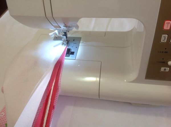 Logo após, envolva o cordão na tira rosa e posicione entre a faixa branca e faixa floral, coloque na máquina de costura a sapatilha especial de pregar cordão e costure.