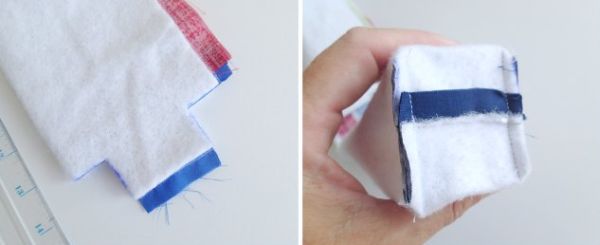 Em seguida, corte os cantos da parte do fundo e costure-o formando uma base reta. E costure as laterais, mas deixando uma abertura.