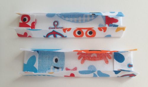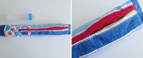 Logo após, costure as tirinhas na parte de cima de seu porta-mamadeira. Porém você deve lembrar-se de dobrar a peça ao meio, pois o comprimento total é o dobro do comprimento da mamadeira.