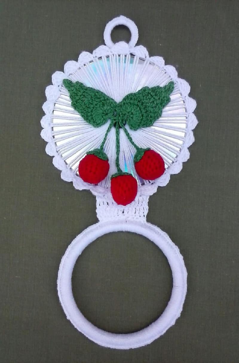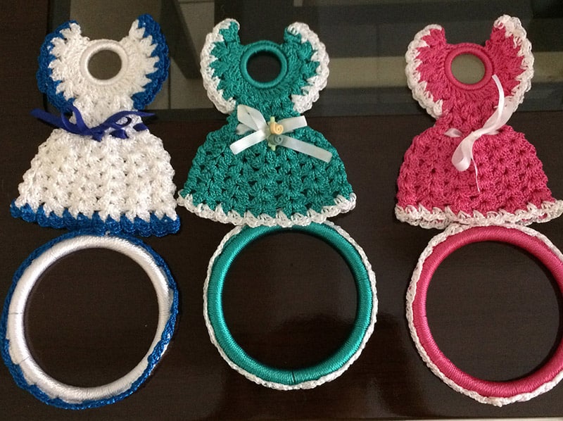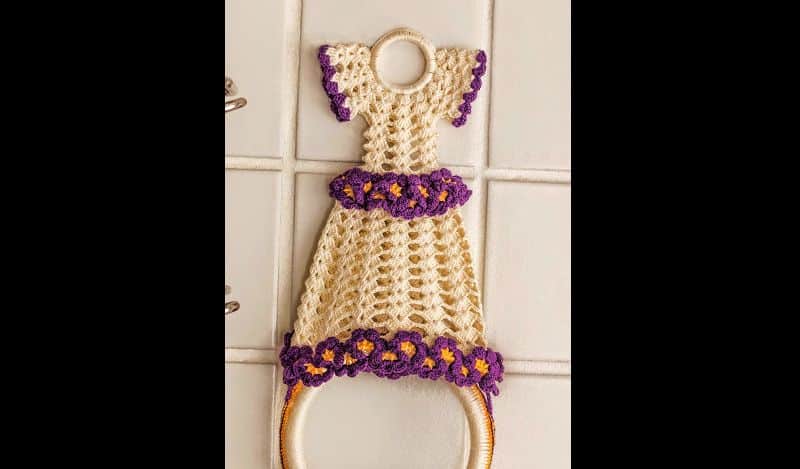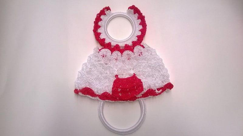 Um vestidinho de crochê pode virar também um porta pano de prato. Siga o gráfico do vestido e faça um caseado de crochê ao redor da argola.