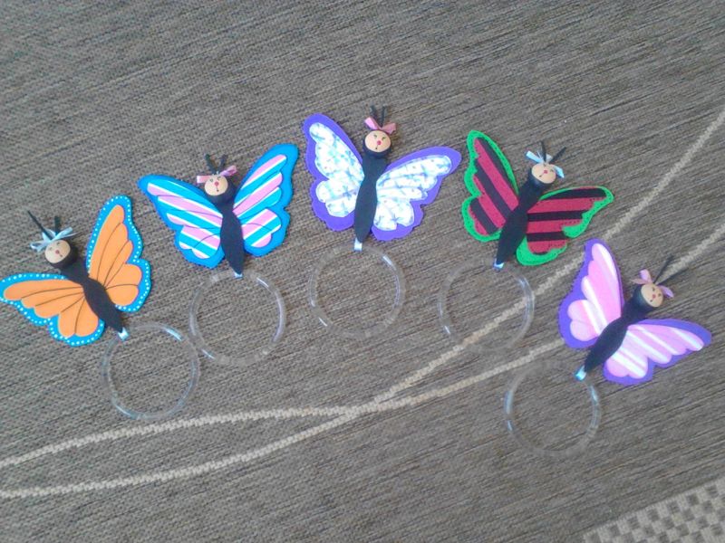Comece separando todos os materiais que você vai utilizar em seu artesanato. Transfira as partes do molde para as respectivas cores de EVAs, com o auxílio do palito para churrasco, para não ficar marcas de lápis ou de caneta nos contornos das partes de EVA. Recorte. Monte a borboleta. Pinte a carinha na bolinha e cole a bolinha no corpo da borboleta. Faça a antena com o EVA. Para finalizar a sua peça, cole um pedaço de fita, com a argola no meio, na parte detrás da borboleta. E está pronto!