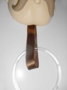 Passe a argola por uma fita com 15 cm e cole atrás da cabeça com a cola Tekbond. E cole outro pedaço de fita na parte de trás do chapéu. Esta será a fita que sustentará o cozinheiro pendurado.