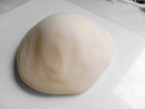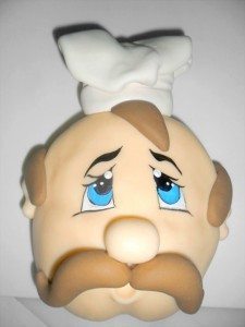 Com o branco clareador líquido e o pó clareador, tinja 150gr de massa branca. Faça um rolo com 85gr com 6cm de altura e dê uma leve achatada. Com a ajuda do palito, una a parte do chapéu à cabeça do cozinheiro. Abra o restante da massa, corte com o cortador redondo, e vá franzindo para conseguir o movimento da aba do chapéu.