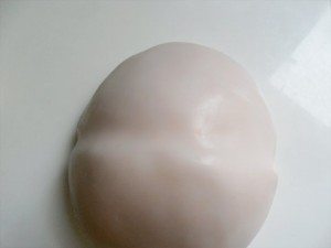 Para fazer a cabeça lixe uma metade da bola de isopor já cortada. Pese 337gr de massa pele para encapar a bola. Mas vá descendo cuidadosamente para encapar e alise muito bem. O que sobrar de massa jogue para a parte de trás e alise com o rolo.