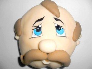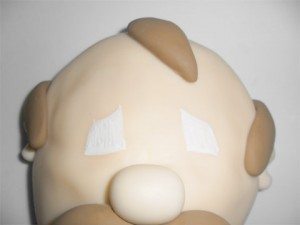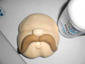Para fazer o bigode e cabelos use a massa marrom. Para cada lado do bigode pese 13gr, faça um rolinho e curve-o em formato de “S” estilizado. Cole abaixo do nariz.