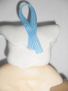 Faça dois laços e una-os com a linha e agulha e cole este laço abaixo das bochechas do boneco com a cola Tekbond. E para dar melhor acabamento ao artesanato, cole em toda parte de trás Eva branco.