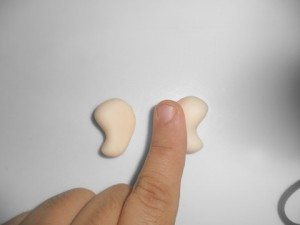 Para fazer as orelhas pese 4gr cada uma e faça uma coxinha e em seguida, achate as laterais. E cole na direção de onde ficarão os olhos.