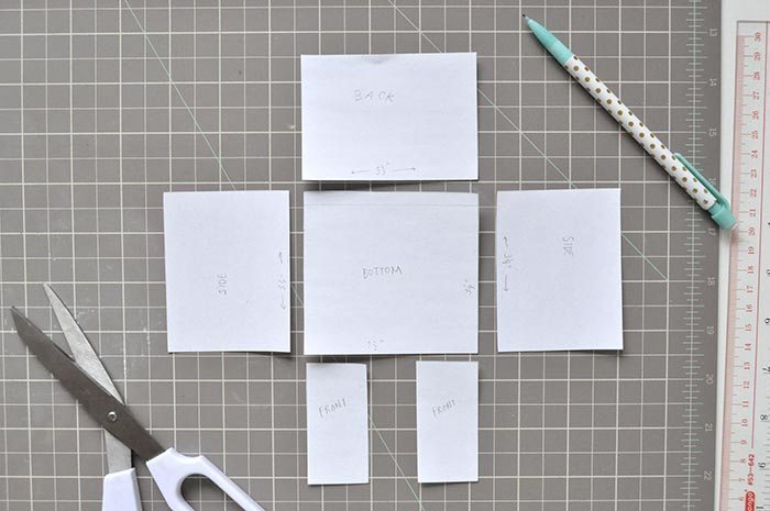 Comece separando todos os materiais que você vai utilizar em seu artesanato. Desenhe em um papel o projeto do seu porta-papel, que deve conter um fundo, três partes laterais inteiras e duas partes menores. Você pode fazer este porta-papel com o tamanho que você desejar ou precisar para guardar os seus pedaços de papel, posteriormente.