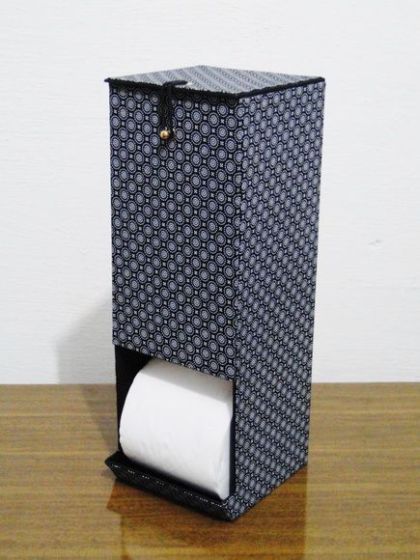 E se você não quiser ter muito trabalho, encape uma caixa de papelão com tamanho condizente com o tamanho do rolo de papel higiênico, com tecido ou papel, e faça uma abertura na parte de baixo, para conseguir um bonito porta papel higiênico.