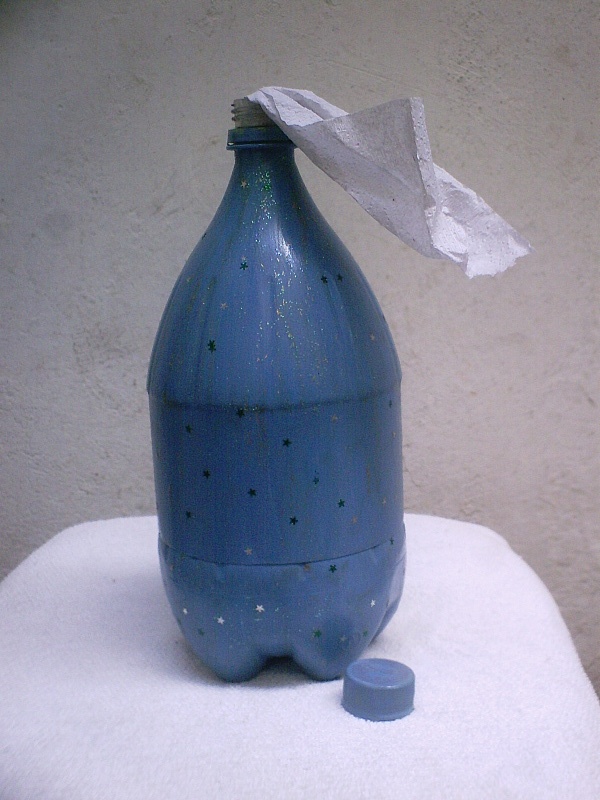 Comece separando todos os materiais que você vai utilizar em seu artesanato. Corte o bico da garrafa, com o auxílio de um estilete ou de uma faca bem afiada. Meça na garrafa a altura do papel higiênico. Perfure a garrafa com a ponta do estilete ou com a ponta afiada de uma faca, na marcação. Termine de cortar com a tesoura. Corte a parte superior com tamanho que consiga se encaixar na parte do fundo. Para finalizar a sua peça, cole os enfeites desejados em toda a sua peça, com o auxílio da pistola de cola quente. E está pronto!