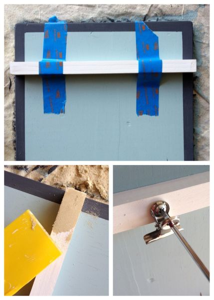 Em seguida, fixe pedaços menores de madeira no pedaço maior, com o auxílio de parafusos. E pinte os pedaços menores, se você quiser.