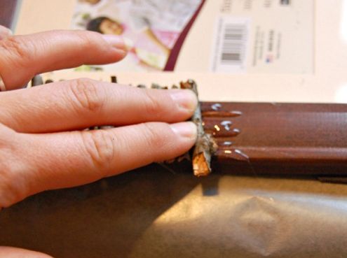 Com todos os gravetos devidamente cortados, comece a colagem em sua moldura com o auxílio da cola quente. Aplique um pouco de cola quente em uma parte da moldura, posicione o graveto, pressione um pouco e parta para a colagem de outro graveto. Faça isso até completar a moldura, e sem deixar espaço vazio entre um graveto e outro.
