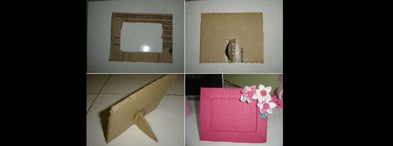 Você pode aproveitar a grande quantidade de papelão que tem em casa e fazer vários tipos de porta retratos. Vale até fazer um modelo de parede, para acomodar várias fotos, com fitas ligando um ao outro.