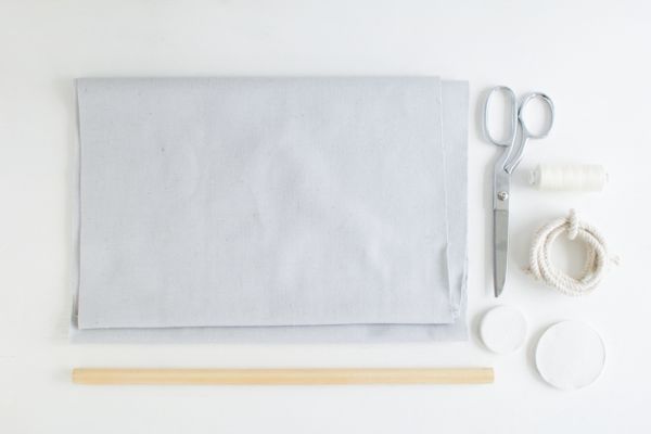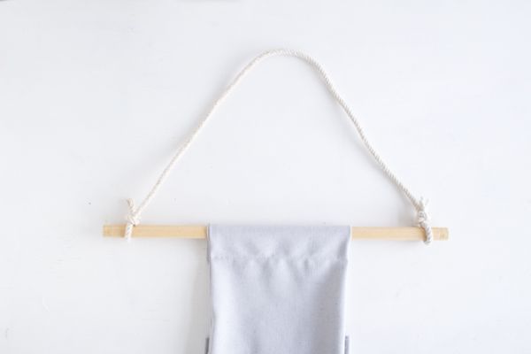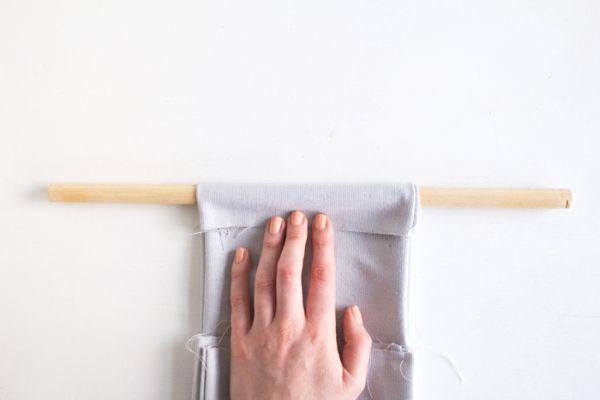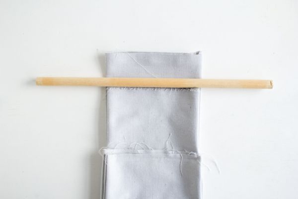 Em seguida, fure as pontas da vareta de madeira. Depois posicione a vareta sobre a parte de cima do tecido.