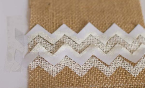Para fazer esta peça você irá precisar de: juta; tesoura; pistola de cola quente; pincel; tinta para tecido com a cor branca (ou com a cor de sua preferência); fio de sisal ou outro fio com estilo rústico de sua preferência; estêncil de ziguezague ou molde feito por você, com cartolina (imagem a seguir); e tag (opcional).