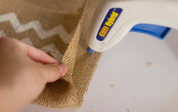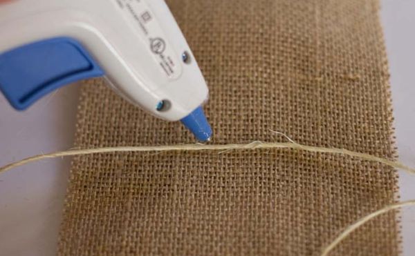 Em seguida, dobre e cole, com o auxílio da pistola de cola quente, as laterais da tira de juta, mas com a pintura para cima.
