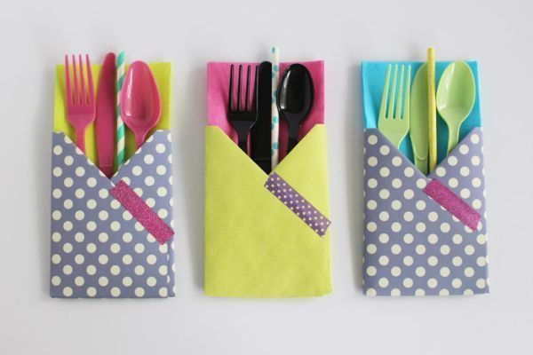 Logo após, para finalizar a sua peça, fixe um pedaço de fita adesiva decorada escolhida na parte diagonal da sua peça, na parte que você dobrou para dentro. E está pronto! Basta acomodar os talheres dentro da sua nova peça.