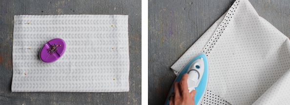 Comece decidindo o tamanho que você quer para o seu porta-treco. Depois corte um retângulo bem grande e dobre-o ao meio e prenda com alfinetes para costura. Costure nas laterais e passe a ferro, para acertar as costuras.
