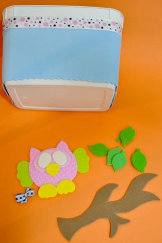 Comece a colar no pote de sorvete o tronco; em seguida as folhas e por último a coruja. E para deixar a corujinha ainda mais charmosa, cole um lacinho na orelhinha.