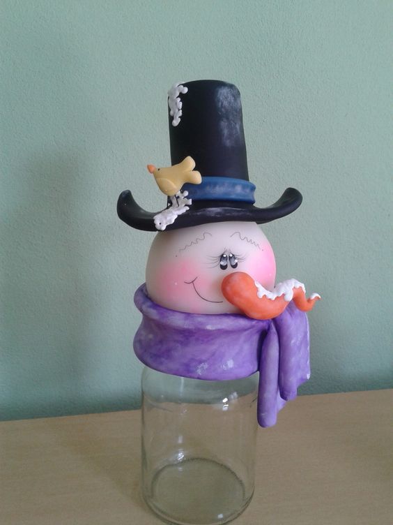 Os potinhos natalinos de biscuit podem ser bem simples, mas bem interessantes. Se você ainda não tem muita experiência em fazer trabalhos com biscuit, pode fazer um boneco de neve, composto por uma bola de massa branca de biscuit e com um nariz de cenoura feito com massa de biscuit laranja. Pinte a carinha do boneco de neve com o modelo que você desejar. A tampa do pote de vidro pode ser decorada com feltro, sianinha, botão e tecido, assim como os detalhes do boneco de neve.