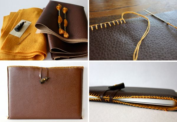 Você também pode fazer um porta-tablet com couro sintético. Forre a peça com feltro, costure as laterais à mão ou à máquina e faça ponto caseado na borda. O fecho pode ser uma tirinha de couro costurada na parte detrás e presa por um botão.