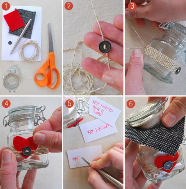 Decore um potinho de vidro com coração de feltro, fio colorido e tecido e coloque dentro mensagens românticas ou guloseimas.