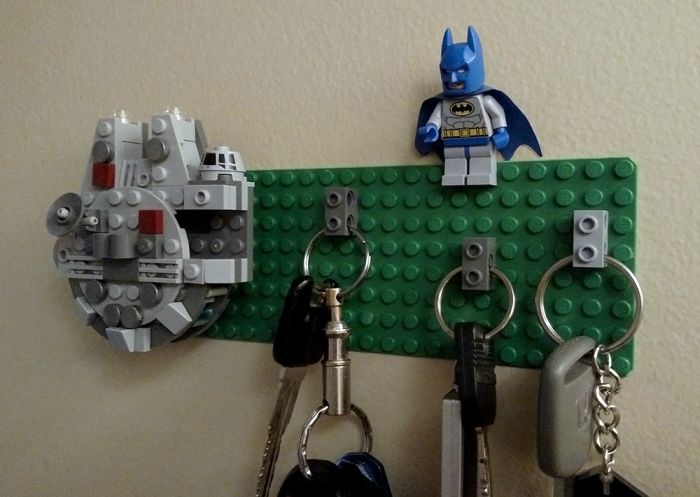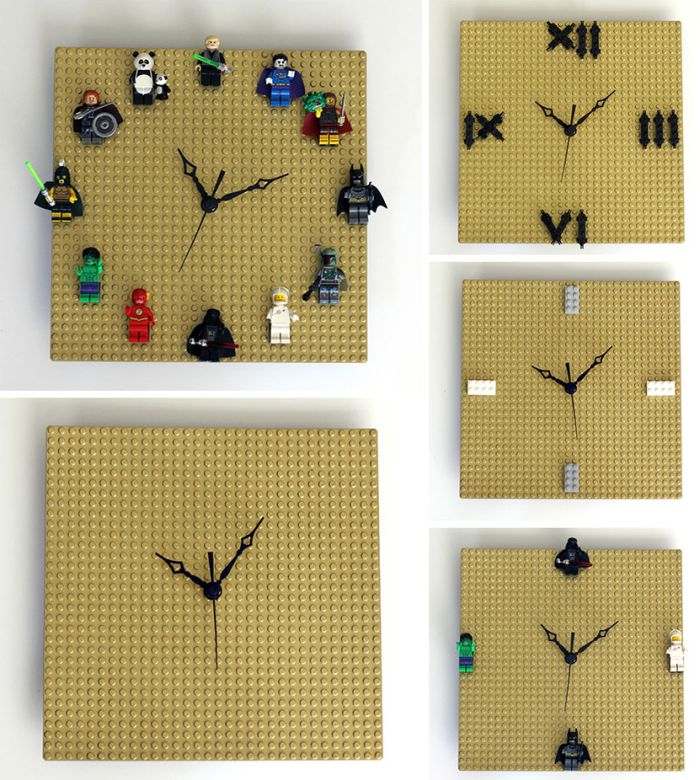 Com Lego você também pode fazer um relógio de parede. Fixe a máquina de um relógio no meio de uma placa para Lego e fixe também personagens geek como se fossem números ou fixe números romanos, se preferir.