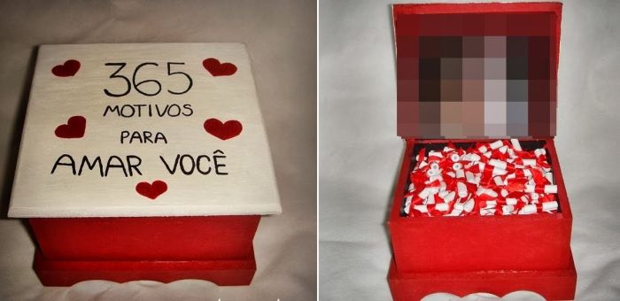 Caixas decoradas com corações de feltro ou com bilhetinhos românticos também são ótimas opções.