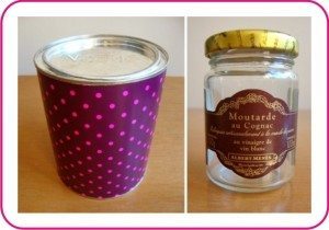 Comece pintando as tampas das embalagens com a tinta. Em seguida, recorte uma tira larga do papel colorido e envolva os vidrinhos e a lata de leite em pó. Logo após faça o laço grande com a fita larga.