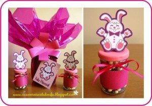 Nos vidrinhos envolva a parte de cima com a fita de cetim e dê um lacinho. E para finalizar cole as figuras dos coelhinhos nas tampas e cole o papel celofane na tampa da lata de leite em pó deixando as pontas como se fosse um ovo de Páscoa. Agora basta encher as embalagens com guloseimas e presentear quem você quiser.