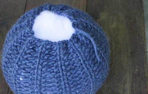 Ponha enchimento dentro do puff . Depois puxe bem a linha para fechar completamente.