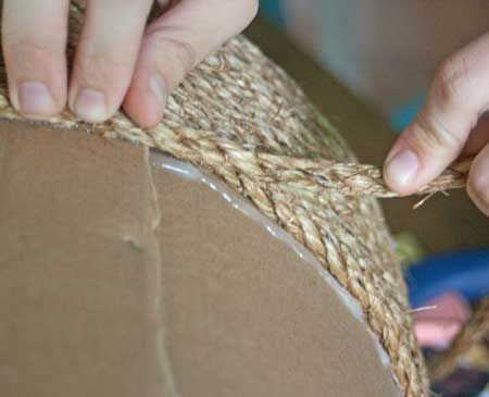 Em seguida, revista toda a estrutura do seu puff com a corda, sempre colando as voltas da corda, com o auxílio da pistola de cola quente. Mas deixe as duas pontas da bobina sem corda.