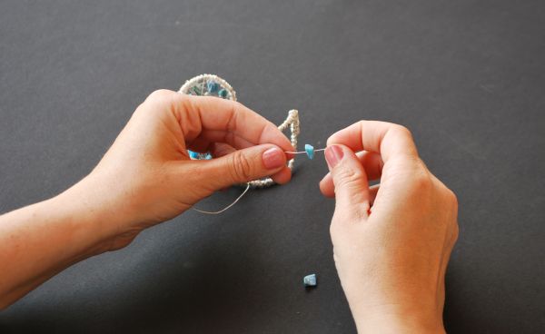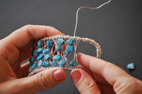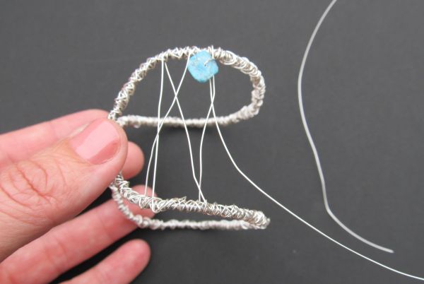 Logo após, trance algumas vezes o arame fino de um lado a outro da pulseira e acrescente uma pedra em meio a estes trançados.