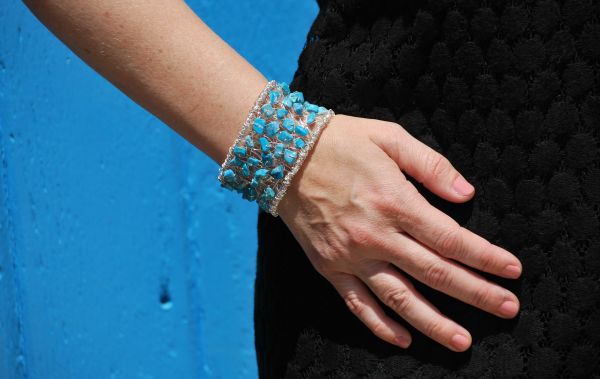 Em seguida, para finalizar a sua peça, assim que chegar ao final do bracelete, fazendo trançados com as pedras escolhidas, arremate muito bem a ponta do arame, para que não se solte e nem machuque você enquanto estiver usando a peça. E está pronto! E a partir desta Idea você pode fazer a pulseira com o modelo que você quiser, até mesmo fazendo mix de pedrarias e não utilizando apenas um modelo de pedra, como o deste exemplo.