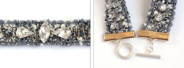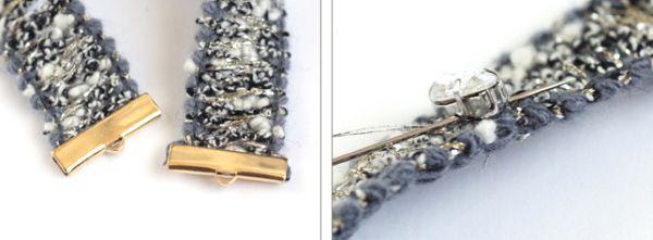 Comece medindo em seu pulso o tamanho que será necessário da base para bijoux para fazer a sua pulseira. Depois posicione o fecho nas pontas, com cola para bijoux dentro, e pressione com o auxílio do alicate, mas com um tecido por cima, para não riscar a peça.