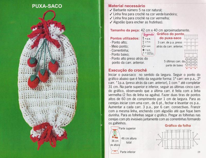 Após fazer todo o “corpo” do puxa-saco, faça os detalhes em vermelho na parte inferior e superior. Faça as cerejas em ponto alto e encha-as com o algodão e faça as folhas seguindo o gráfico. Monte as cerejas e prenda na parte superior do puxa-saco.
