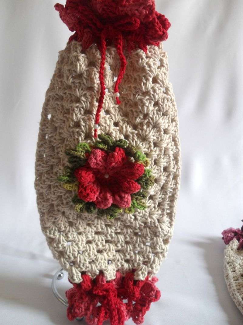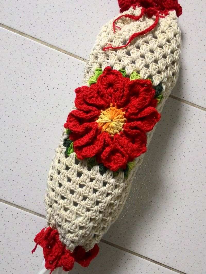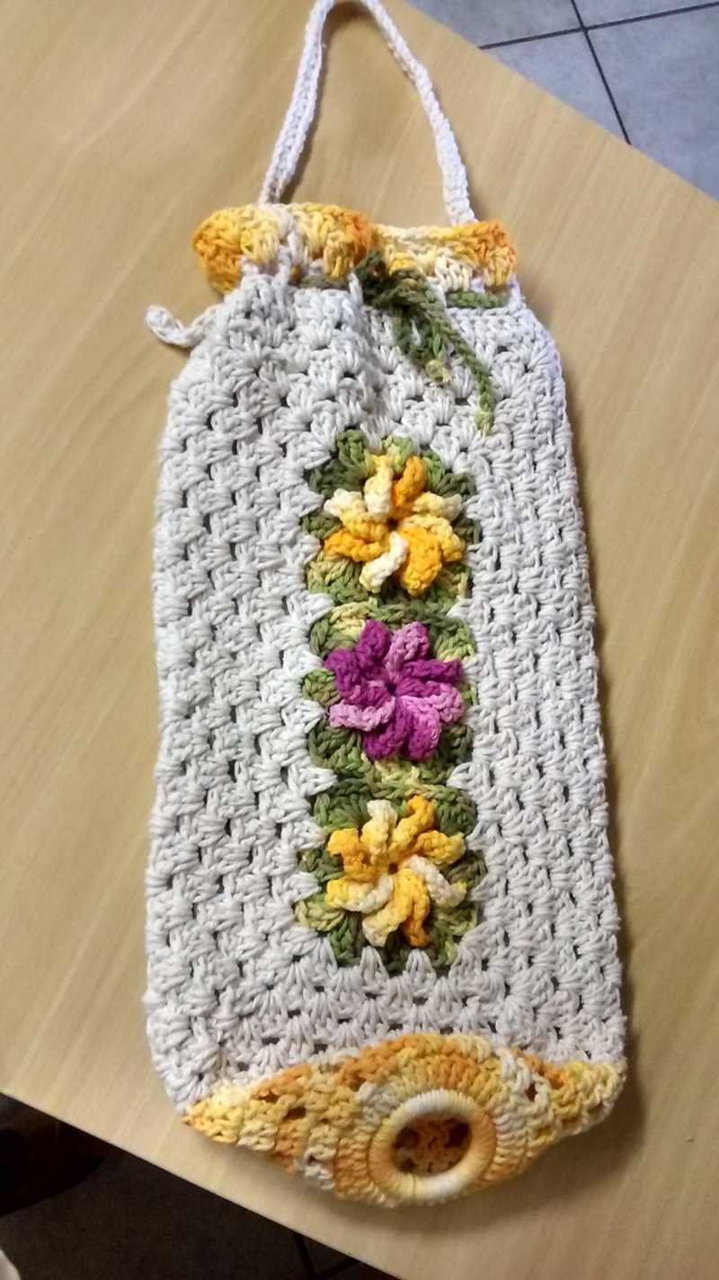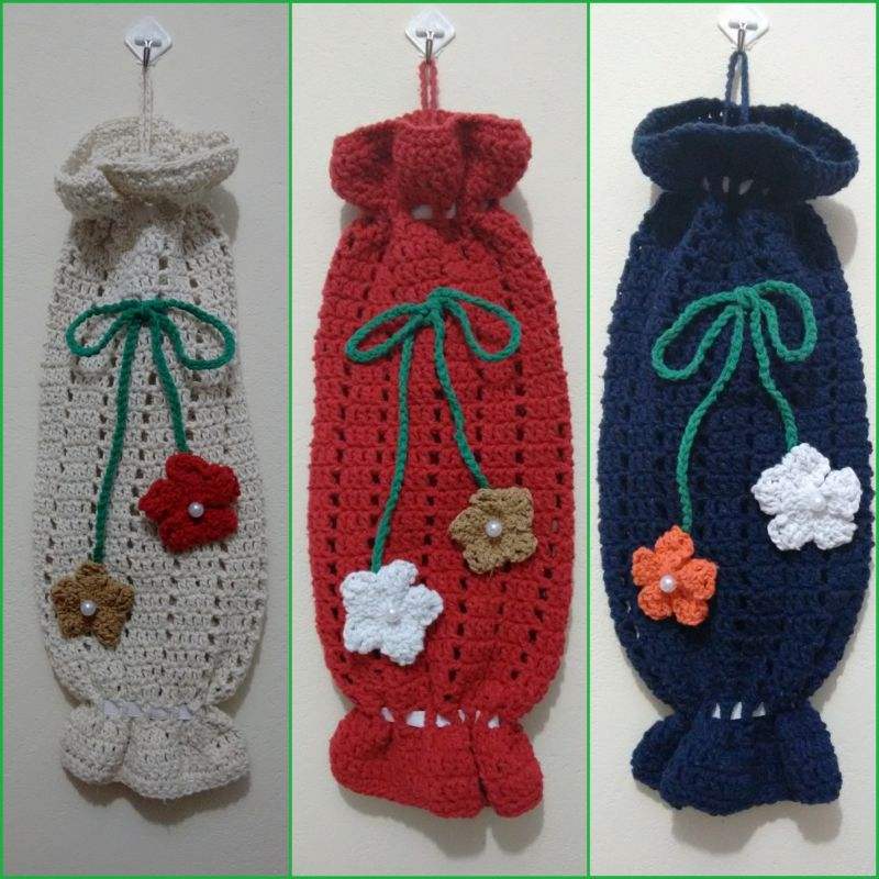 O puxa saco de crochê é uma peça fantástica que organiza e guarda os sacos da sua casa.