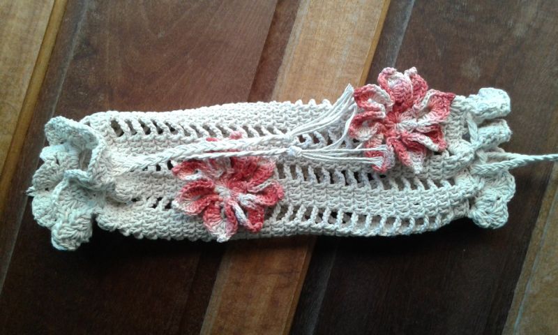 Para finalizar a sua peça, faça cordões de crochê da maneira que quiser e passe pelo puxa-saco, tanto na parte superior quanto na parte inferior. E está pronto!