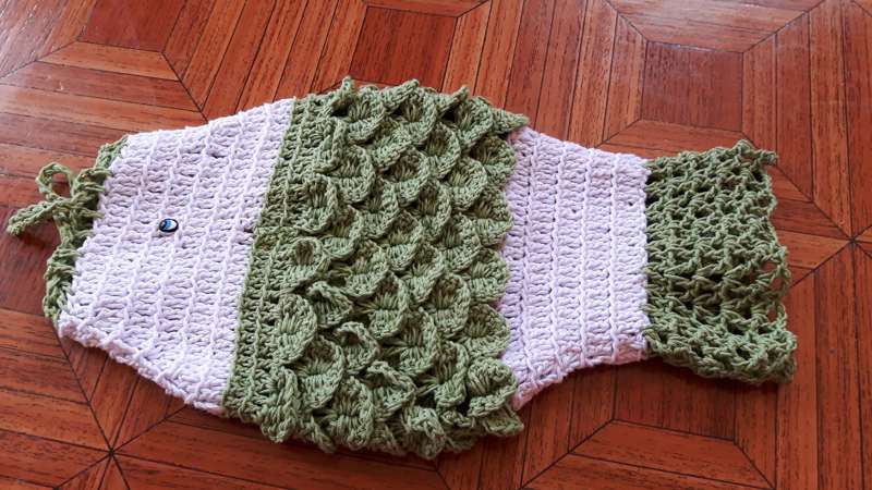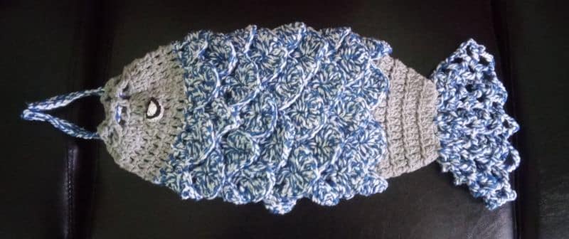 Para o puxa saco de crochê em formato de peixe, você pode usar cores e espessuras de linhas diferentes para tecer os detalhes. Além disso, poderá usar botões para olhos por exemplo.
