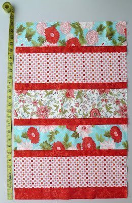 Em seguida, corte tiras largas nos retalhos de tecido, formando a sequência de cores ou de estampas que você preferir e o tamanho que você desejar. Depois corte tiras mais finas nos retalhos de tecido e passe a ferro as extremidades, para o lado do avesso. Costure uma tira larga de tecido à outra. Então, posicione as tiras mais finas de tecido sobre as emendas das tiras mais largas. Costure dos dois lados das tiras mais finas, para prendê-las.