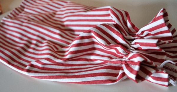 Em seguida, costure o puxa-saco, costurando um cilindro com elástico na barra, para fechar.
