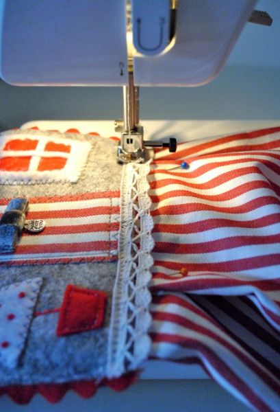 Agora, costure passamanarias ao redor da casinha, costure uma parte atrás no telhado, costure o telhado na casinha e termine e decorar a sua casinha de acordo com a sua preferência.
