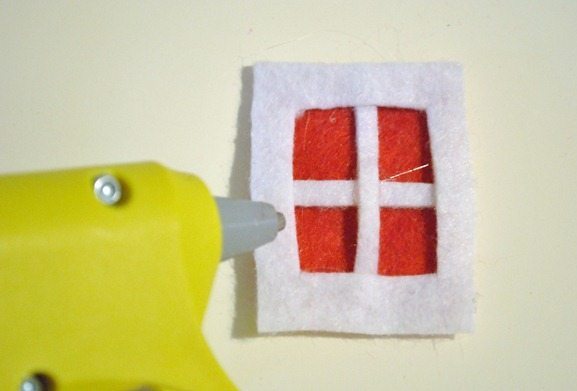 Comece transferindo as partes do molde para as respectivas cores dos tecidos e dos feltros escolhidos. Depois fixe a entretela dupla face termocolante no detalhe da porta e fixe este detalhe na porta.
