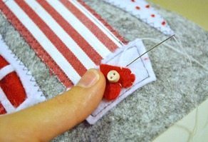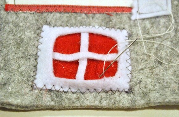 Logo após, comece a bordar, fixando, os outros detalhes da casinha, com o auxílio da agulha para bordado e da linha para bordado.