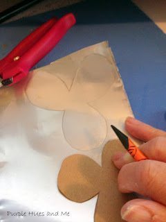 Logo após, risque e corte na latinha aberta flores com tamanhos decrescentes e com três pétalas. Você pode fazer a flor e a folha com o modelo que você desejar. Corte um miolo com o modelo que você desejar.