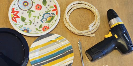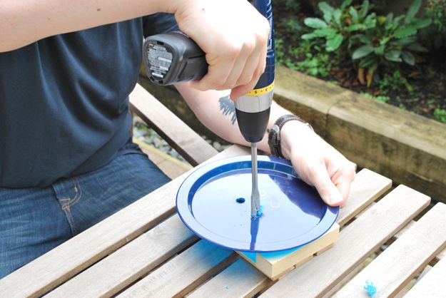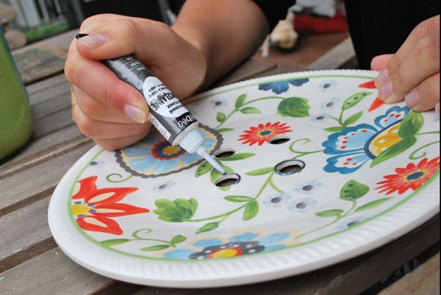 Meça o centro do prato escolhido, com o auxílio da régua e do lápis, desenhe onde os furos irão ficar ao final do trabalho. Fure o seu prato com o auxílio da furadeira com broca específica para furar plástico, fazendo dois ou quarto furos, dependendo de sua preferência.