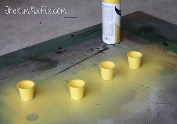 Comece forrando o local onde você vai pintar as suas peças com jornal velho, papel velho, papelão ou plástico. Depois pinte os copos descartáveis escolhidos com a tinta em spray com a cor de sua preferência.