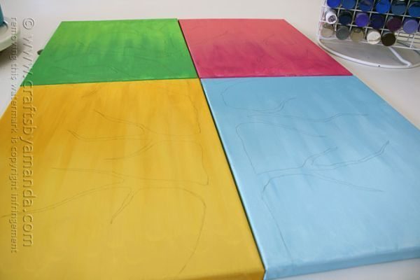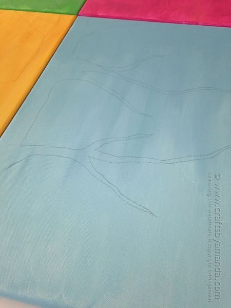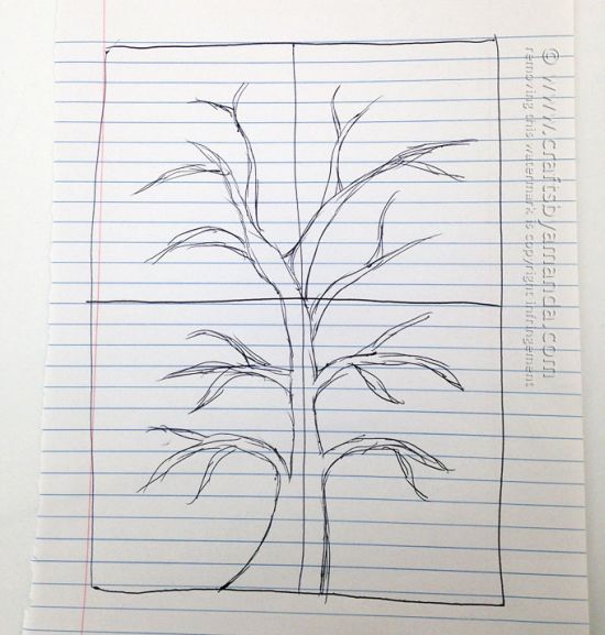 Comece desenhando o seu projeto me um papel comum, mas com os galhos de sua árvore devendo tomar as quatro telas, quando estas estiverem penduradas juntas.